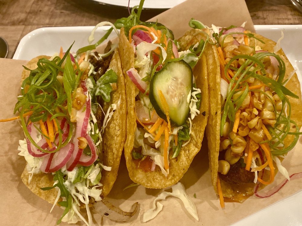 Crispy pork belly, grilled pineapple, arugula slaw, carrots, cilantro, pickled onion. roasted corn, scallion curl, spicy aioli