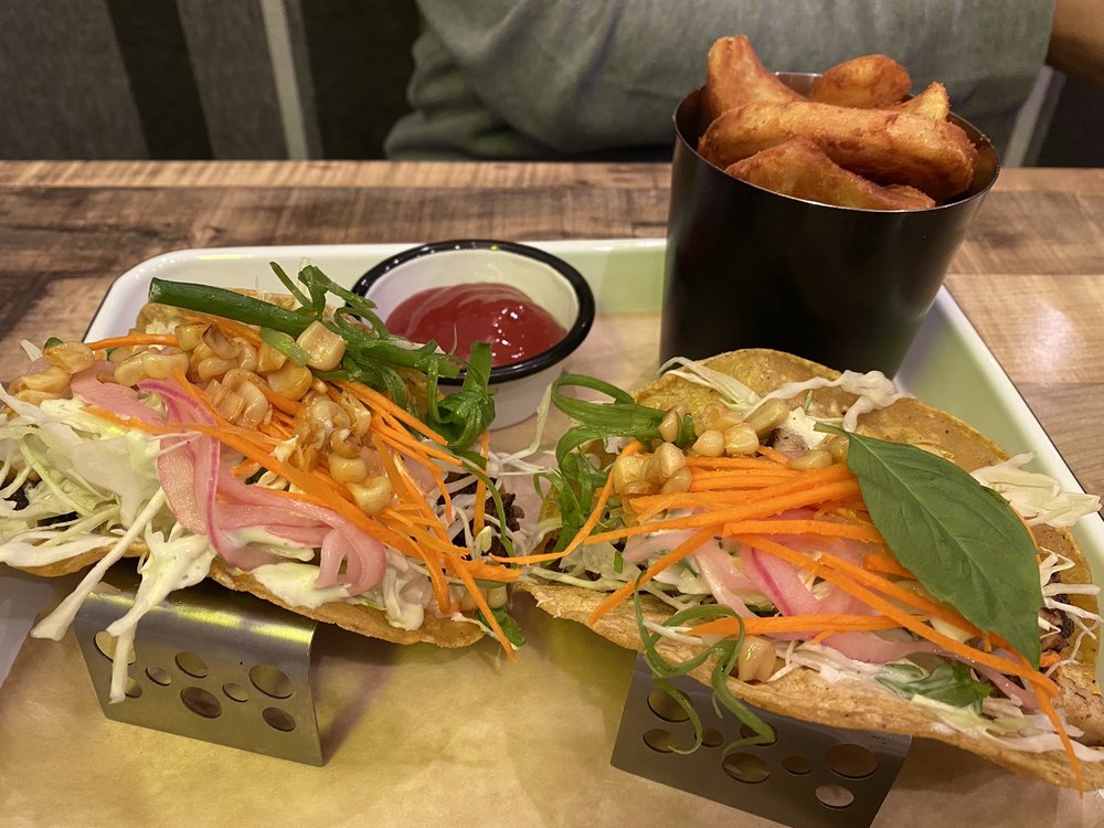 House made edamame falafel, arugula slaw, carrots, cilantro, pickled onion. roasted corn, scallion curl, house aioli