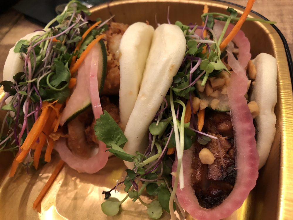 Crispy pork belly, arugula saw, carrots, cilantro, pickled onion, roasted corn, scallion curl, spicy aioli